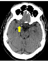 Figure 2. The yellow arrow points to the hyperdense artery sign at the terminus of the right internal carotid artery and extended into the middle cerebral artery on the patient’s non-contrasted CT brain scan (Figure 1).