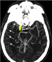 Figure 4. Patient’s CT angiography scan (from Figure 3). Figure 4A shows abrupt cessation of blood flow caused by the occlusion of the right internal carotid artery terminus and right middle cerebral artery (solid yellow arrow) while maintaining some distal cerebral collateral flow (white arrows). On Figure 4B, the open yellow arrow points to the symptomatic carotid atheroemboli from severely stenotic proximal right cervical internal carotid artery.